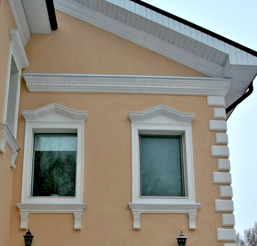 Окна в классическом стиле декорируются наличниками, сандриками, фронтонами из разных материалов, наиболее легким из которых является полиуретан.
