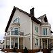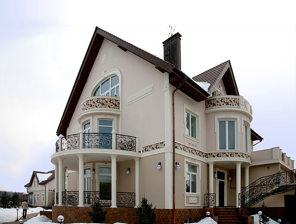 Светлая гамма теплых оттенков, выбранная для данного дома, сделала его приветливым и нарядным. Первый этаж дома окрашен в светло-кофейный цвет, а для второго этажа был подобран оттенок топленого молока. Лепной декор выдержан в нежно-кремовом цвете. Цоколь отделан рыжевато-коричневой плиткой, а крыша покрыта черепицей насыщенного темно-коричневого цвета.