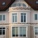 Еще одна интересная декоративная деталь - прямоугольные панели, выполненные из молдинга мм0560 с цветочным рисунком. Панели, вытянутые в поперечном направлении уравновешивают устремленные ввысь колонны, гармонизируя фасад. Также панели используются в качестве подоконных элементов для окон бокового фасада гостевого дома.