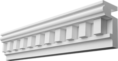 Вдоль кровли на фронтонах здания проходят уже знакомые карнизы с прямоугольными сухариками, переходящие в молдинг мм0260 в котором сочетаются профили полочка, гусек, желоб и вал.