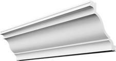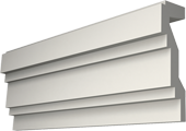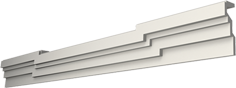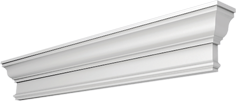 Наиболее сложным по форме декоративным элементом во внешнем декоре загородного дома является массивный составной карниз, проходящий по нижней границе фронтона центрального фасада и под свесами кровли по боковым фасадам. Верхнюю часть карниза составил молдинг мм0500, в котором сочетаются классические профили каблучок и полочка, а нижняя часть карниза – это молдинг мм0480 с рельефно выступающими над поверхностью прямоугольными сухариками. Несмотря на довольно простой рисунок карниз в сборе представляет собой необычный и эстетически привлекательный декоративный элемент отделки фасада загородного дома. Широкая полоса карниза несколько скрадывает высоту остроконечной крыши, делая всю постройку более пропорциональной.